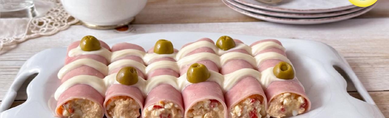 3- Sobre cada feta de jamón ponemos un poco del relleno de ensalada rusa, colocamos los tomates, enrollamos formando un cilindro, y ya tenemos el primer canelón listo, continuamos hasta hacer todos.
