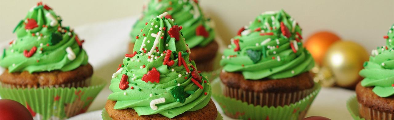 Cuando estén fríos, batir las claras a nieve y agregar una cucharada de azúcar por cada una hasta obtener punto merengue. Agregar colorante. Colocar el merengue en una manga. Hacer los copos sobre los muffins ya frío y agregar toppings de confites rojos, plateados, dorados, y todo lo que vos quieras.