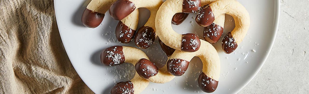 Una vez frías las masitas, introducir las puntas del semicírculo en el chocolate fundido y disponer sobre una rejilla hasta enfriar.